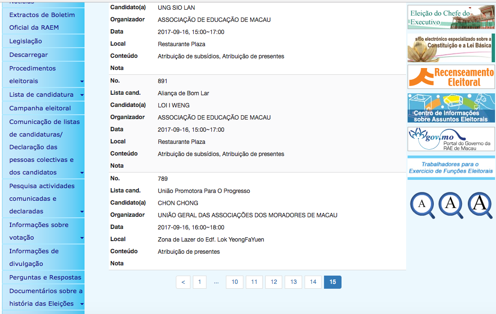 Os dados constam da página da CAEAL, sob uma lista de “participações dos candidatos em atividades que não seja propaganda eleitoral mas destinada a atribuir benifício” e outra de “atividades que não seja propaganda eleitoral mas destinada a atribuir benefícios” [sic.]. Esta última, arrolava na quarta-feira 89 iniciativas de organizações locais, não consideradas atividade de campanha e que consistem na sua maioria em almoços, atribuição de prémios e subsídios, a decorrer entre os dias 1 e 17 de setembro. A maioria são organizadas por associações ligadas a candidatos a sufrágio direto ou indireto nas eleições de domingo.