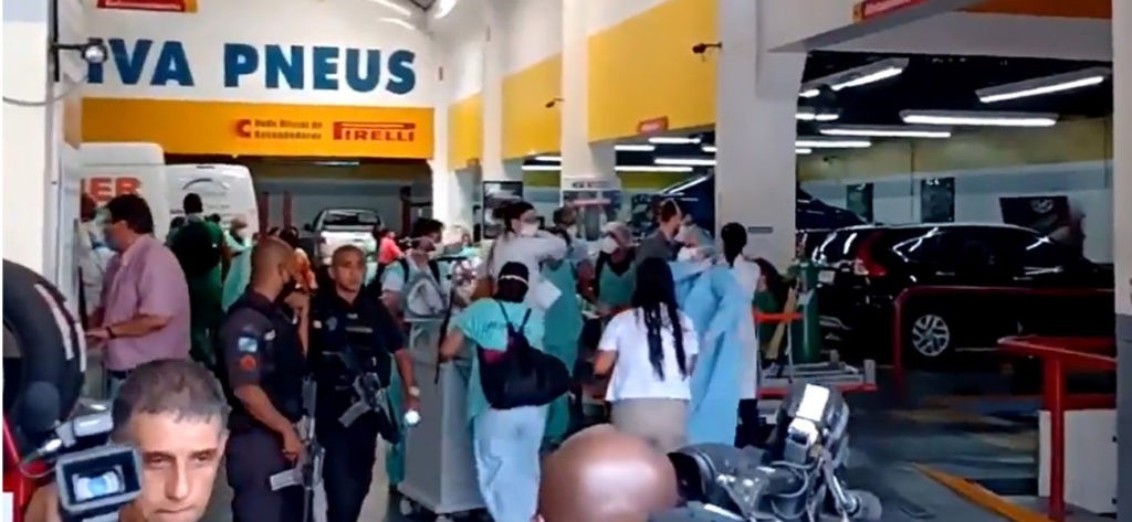 Uma loja de pneus está a ser usada para receber os pacientes que estão a ser retirados do Hospital Federal de Bonsucesso, após um incêndio atingir uma ala da unidade de saúde. Familiares e voluntários ajudam na remoção.