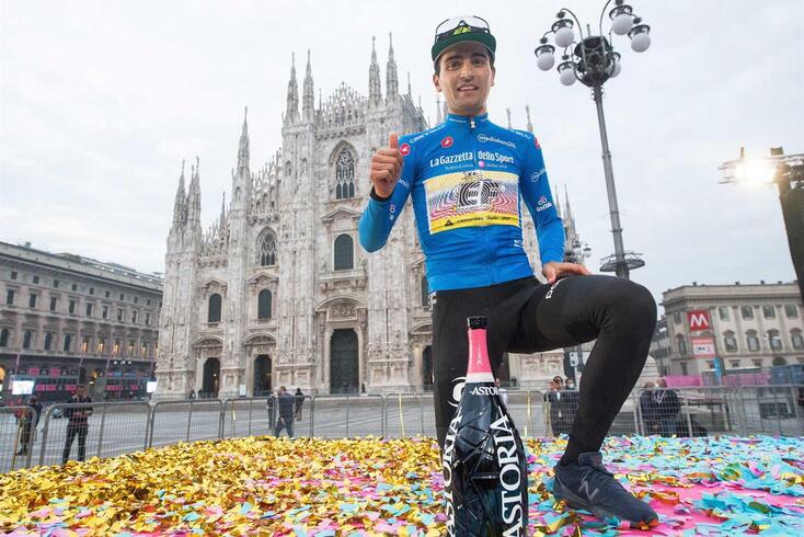 Após um dia intenso, que começou com a viagem de Milão para Lisboa, logo de manhã, e prosseguiu com uma tarde recheada de compromissos com a comunicação social na capital, o vencedor do prémio da montanha foi recebido já perto das 21:00 com bolo, champanhe, balões e várias t-shirts azuis estampadas com a foto da vitória na nona etapa, em Roccaraso, onde vestiu pela primeira vez a camisola com que acabou a corrida.