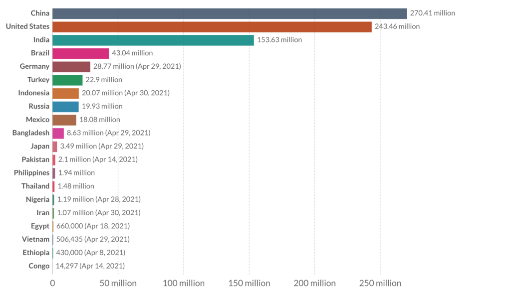 Doses de vacinas administradas, 20 países mais populosos, 1 de Maio