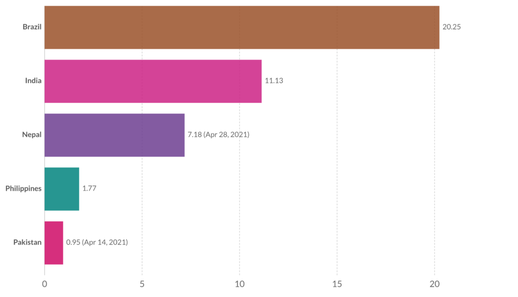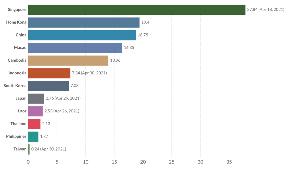 Vacinas administradas por cada 100 pessoas, Sudoeste Asiático, 1 de Maio