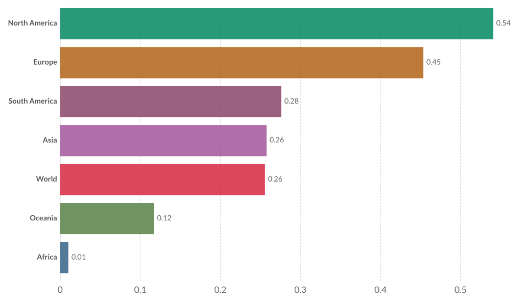 Doses de vacinas administradas por cada 100 pessoas, Mundo/Continentes, 1 de Maio