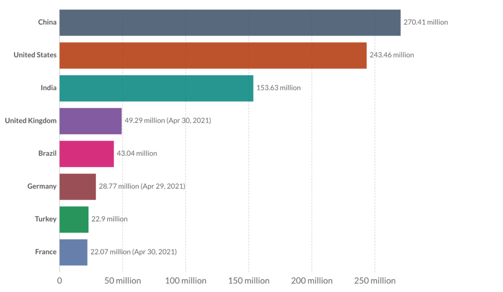Doses de vacinas administradas, 8 países com maior inoculação, 1 de Maio