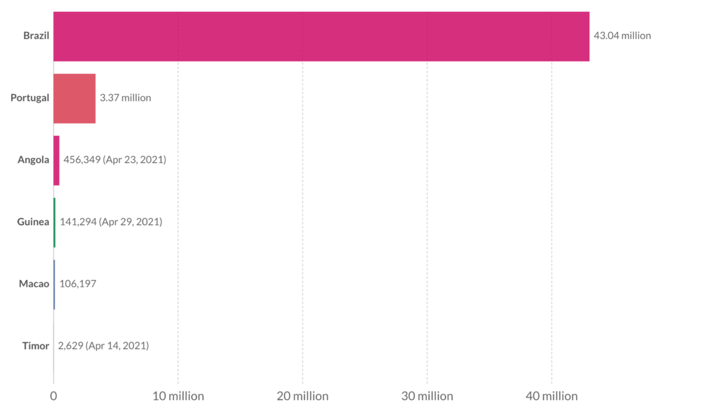 *Nota: Moçambique contava com 57.200 vacinados a 24 de Março, Cabo Verde com 2,100 a 24 de Março e São Tomé e Príncipe com 9.700 a 29 de Março
