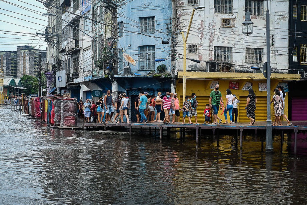 No centro, algumas ruas da região do porto estão interditadas. A prefeitura montou passarelas sobre as calçadas e vias alagadas e transferiu a tradicional feira de peixes para uma balsa. Já os comerciantes improvisaram barreiras com sacos de areia e vêm jogando cal na água parada para tentar neutralizar o cheiro insuportável de fezes.
