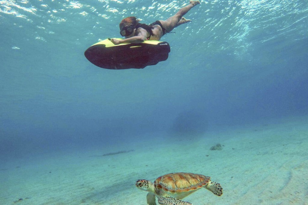 Mas não são só os turistas que aparecem naquele mar paradisíaco, por causa das tartarugas. O aparecimento de tubarões naquela baía tornou-se constante, mas nada que alarme.