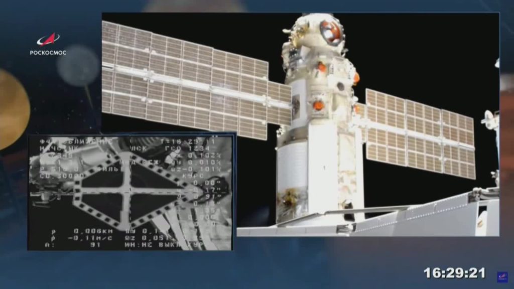 “Contato confirmado!”, tuitou o diretor da Roscosmos, Dmitri Rogozine, ao anunciar o acoplamento do módulo.