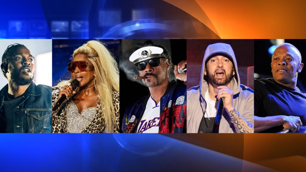 Os cantores de rap e hip hop Dr. Dre, Snoop Dogg, Eminem, Mary J. Blige e Kendrick Lamar vão se apresentar durante o intervalo do próximo Super Bowl, a grande final do futebol americano que será em Los Angeles