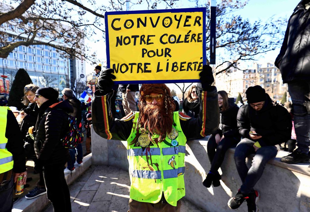 在法國,示威群眾不滿需出示疫苗護照才能進餐廳、咖啡館及其他公共場所的防疫管制,這是總統馬克宏(Emmanuel Macron)推廣疫苗接種採取的措施之一。