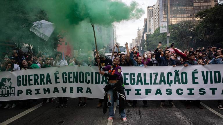 Passava das 14h30 deste sábado (11) quando uma faixa branca, de 10 metros de largura por 3 metros de altura, com a frase “Legalize Já!”, escrita na cor verde, misturou-se às árvores de mata atlântica do parque Trianon, na avenida Paulista, em frente ao Masp. Estava dada a largada presencial para a Marcha da Maconha, após um hiato de dois anos, em formato virtual, por causa da Covid.