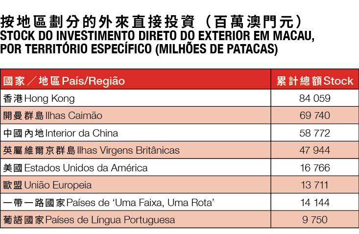 Citando dados estatísticos, Samuel Tong aborda também os destinos do investimento externo, que se prendem geralmente à indústria do jogo e atividades financeiras, sendo que constituem 67 por cento do investimento total.