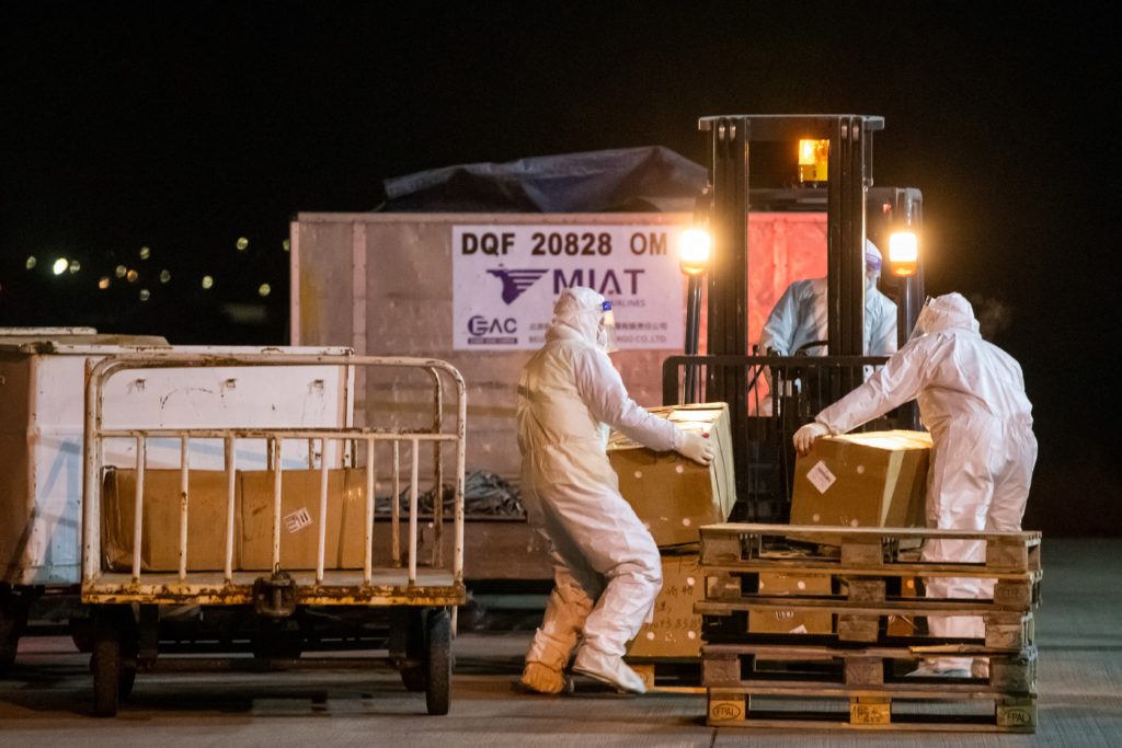 Workers unload a shipment containing Sinopharm Covid-19 coronavirus vaccines from China at an airport in Ulaanbaatar, the capital of Mongolia on February 23, 2021. (Photo by Byambasuren BYAMBA-OCHIR / AFP)