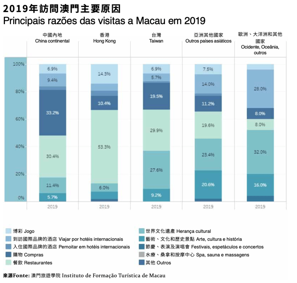 Há mais de uma década que os visitantes do Continente chegam a Macau maioritariamente para realizar compras. Restaurantes é o que mais atrai os visitantes de Hong Kong e Taiwan. A herança cultural traz ocidentais e restantes turistas asiáticos. Infraestruturas que ainda se mantêm, mesmo com o abalo provocado pela Covid-19. “São as ofertas não jogo que temos neste momento”, diz Glenn McCartney, professor de Gestão Integrada de Turismo e Hotelaria na Universidade de Macau.