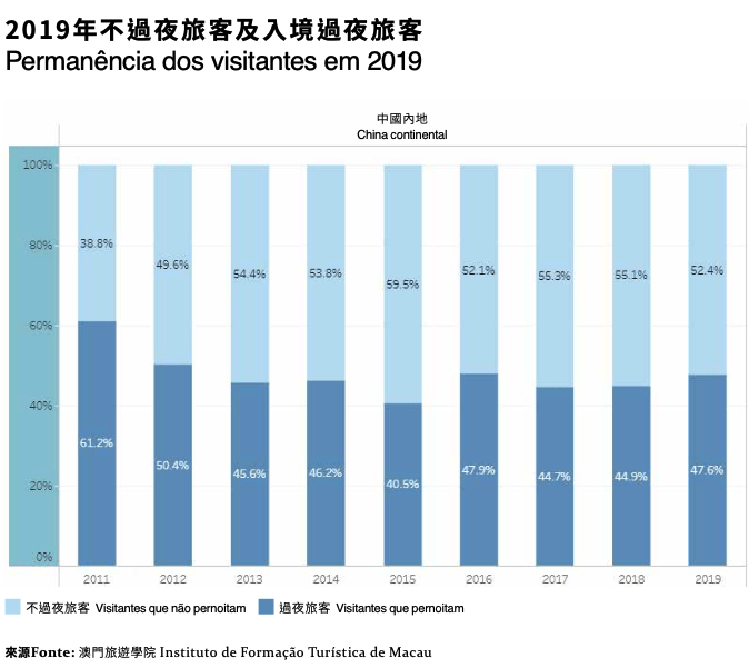 Macau recebeu cerca de 39.4 milhões de visitantes (108 mil visitantes diários) em 2019. A proporção entre residentes e turistas foi de um para 60. E mesmo perante um movimento abundante, desde 2013 que mais de metade dos visitantes não pernoita em Macau, segundo um estudo conduzido pelo Instituto de Formação Turística (IFT), em 2019. No mesmo ano, o período de permanência dos visitantes foi de 1.2 dias.