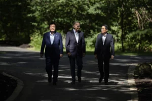O presidente coreano Yoon Suk Yeol, o presidente dos EUA, Joe Biden, e o primeiro-ministro japonês, Kishida Fumio, chegam a Camp David (Foto de CHIP SOMODEVILLA/GETTY IMAGES NORTH AMERICA/Getty Images via AFP)