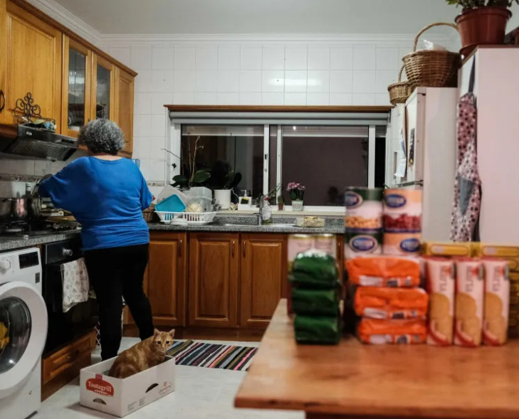 Divorciada há 16 anos, Maria, 54 anos, nunca teve qualquer apoio do ex-marido para garantir o sustento dos dois filhos, hoje com 25 e 19 anos. É com o salário mínimo, no valor de 760 euros, que paga a renda, a luz, o gás, a água, os medicamentos e os alimentos que não vêm no cabaz do Programa Operacional de Apoio às Pessoas Mais Vulneráveis. “Como a comida não sobra, comemos muito sopa.”