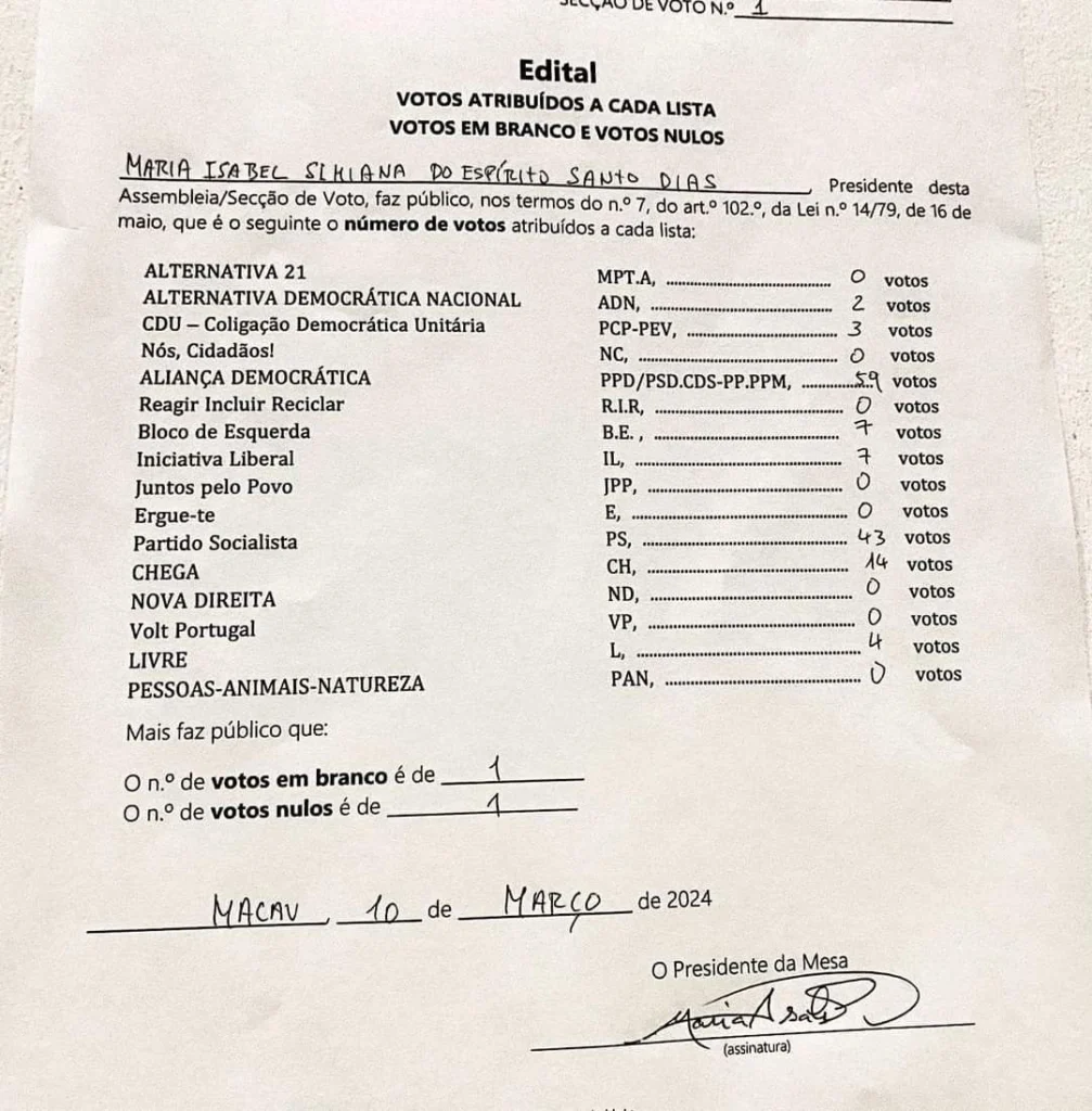 O Chega conseguiu 14 votos que lhe garantem o terceiro lugar, seguindo-se o Bloco de Esquerda e a Iniciativa Liberal, com sete votos cada, o Livre com quatro, o PCP-PEV com três e a ADN (Aliança Democrática Nacional) com dois.