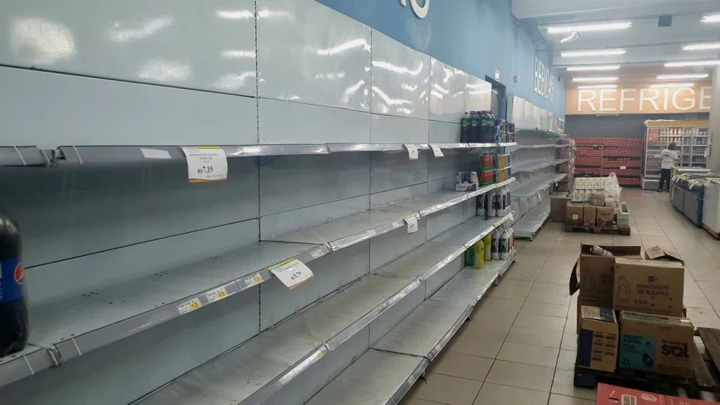 A reportagem circulou nesta quarta (8) por mercados de diferentes bairros da cidade e encontrou prateleiras vazias e falta generalizada de álcool em gel e de alimentos como pão e ovo. O maior problema, porém, é a falta de água, cada vez mais rara na cidade. Nos locais onde ainda é possível achá-la, logo se formam grandes filas.