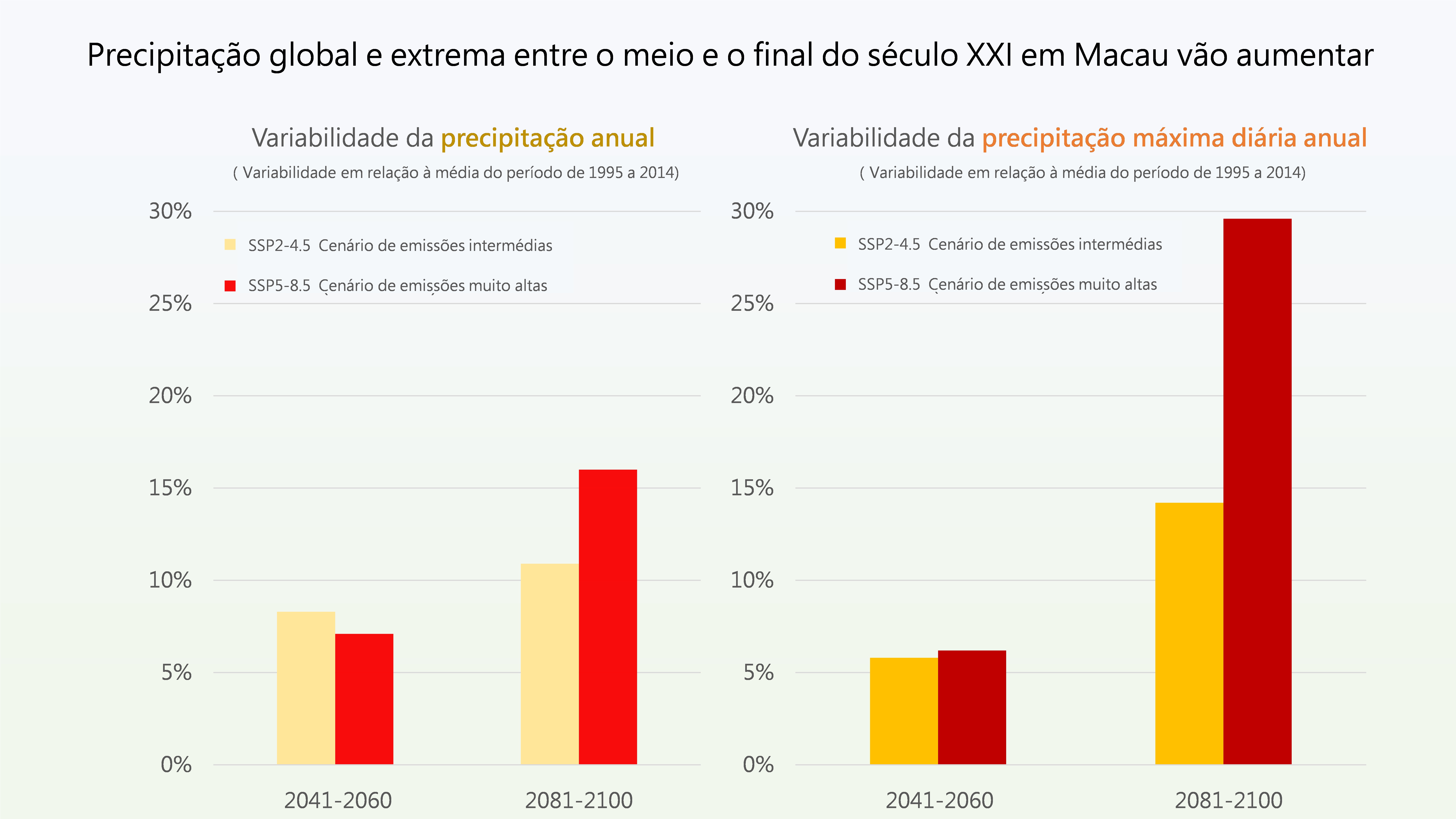 Como ilustra a figura 1, independentemente de se tratar de um cenário de emissões intermediárias ou de um cenário de emissões muito elevadas de gases de efeito estufa, a investigação sugere que a precipitação global e os fenómenos de precipitação extrema em Macau vão aumentar:
