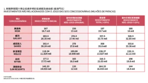 De acordo com a análise do Macau Daily News às declarações das concessionárias à bolsa de Hong Kong, o montante investido em elementos não jogo passa agora para cerca de 130.42 mil milhões, o que representa um aumento de 21.6 mil milhões face ao compromisso original. O investimento total – incluindo jogo – aumenta então para 140.54 mil milhões de patacas.