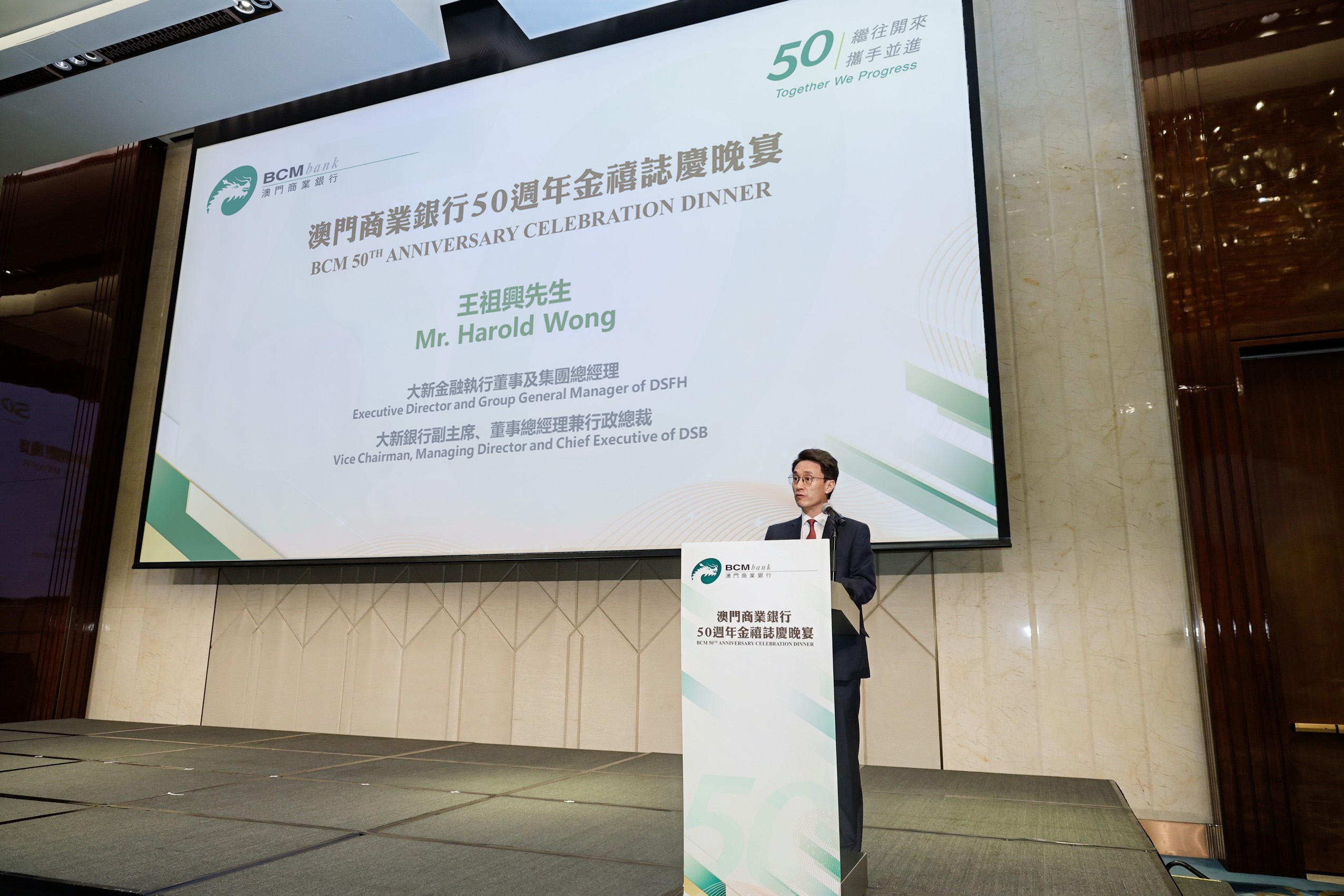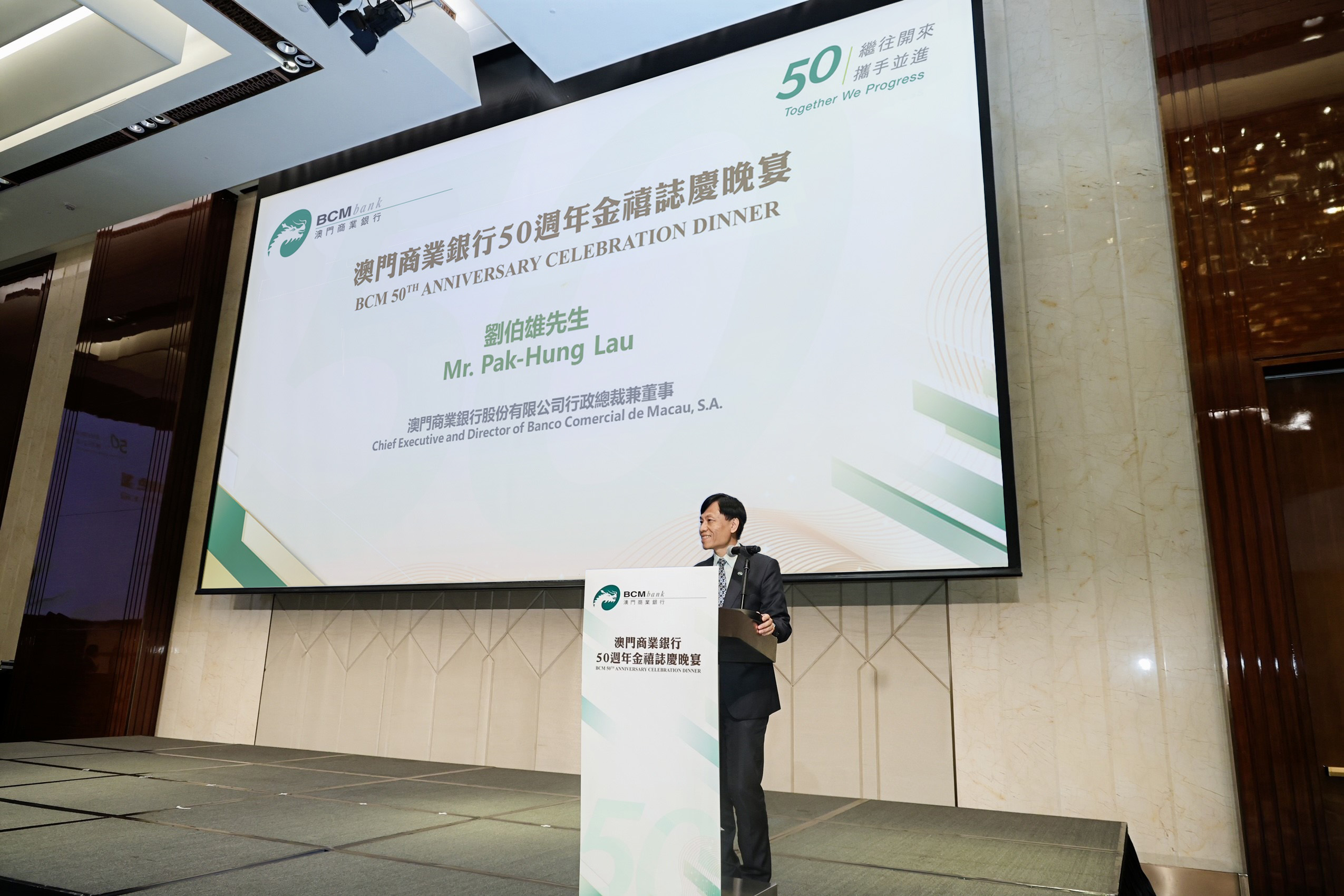 O Sr. Harold Wong, Diretor Executivo e Presidente do Dah Sing Bank, Limited (“DSB”), o Sr. Pak-Hung Lau, Diretor Executivo do BCM, juntamente com as equipas de gestão do BCM, líderes do Governo da RAEM e da comunidade, participaram no jantar para oficializar esta significativa celebração do jubileu de ouro, na companhia de parceiros comerciais e clientes de longa data do BCM.