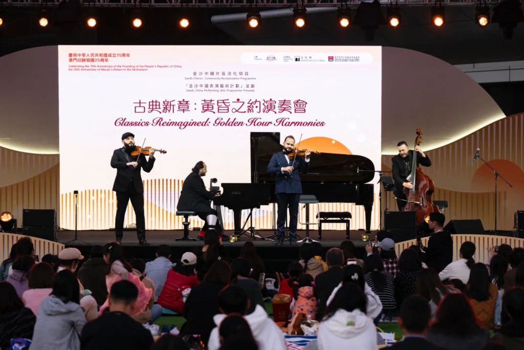 No passado fim de semana, a 30 de novembro e 1 de dezembro, a Sands China organizou o concerto “Clássicos Reimaginados: Harmonias da Hora Dourada” na Praça do Centro Cultural de Macau. Suaves melodias atraíram um público muito variado que, sentado ou de pé, desfrutou do ambiente descontraído, mas também vibrante, criado pela combinação de cordas, piano e harmónica.