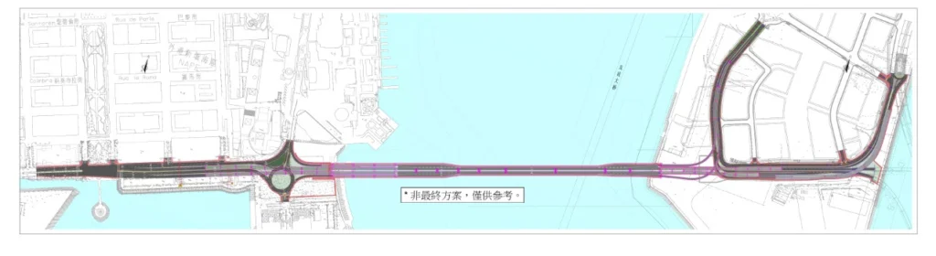 Dados oficiais indicam que o viaduto custará cerca de 2.18 mil milhões de patacas e terá aproximadamente 3.2 quilómetros de extensão, incluindo uma estrutura principal de cerca de 1.550 metros e mais 900 metros sobre o mar. O projeto contempla quatro secções navegáveis, cada uma com cerca de 130 metros, e o ponto mais alto da construção rondará os 25.8 metros acima do nível do mar. O Governo garante que, por não se tratar de construção de edifícios, esta obra não está sujeita a determinadas regulamentações, sendo que o contrato vigorará entre outubro de 2024 e outubro de 2027.