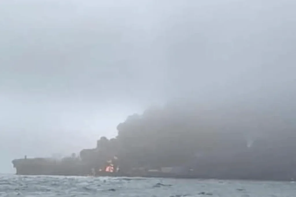 Os dois barcos estão envoltos em chamas e vários outros navios de resgate de combate a incêndios foram enviados para o local da colisão, que aconteceu ao largo da cidade de Hull, no nordeste de Inglaterra.
