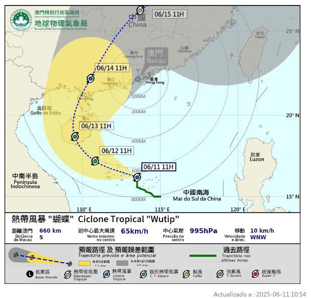 Às 11:00 horas, o Wutip encontrava-se a cerca de 660 quilómetros a Sul de Macau. O sistema está a mover-se para Oes_noroeste, á velocidade de 10 quilómetros/hora, genericamente, para a área entre a costa oeste de Guangdong e a Ilha de Hainan.
