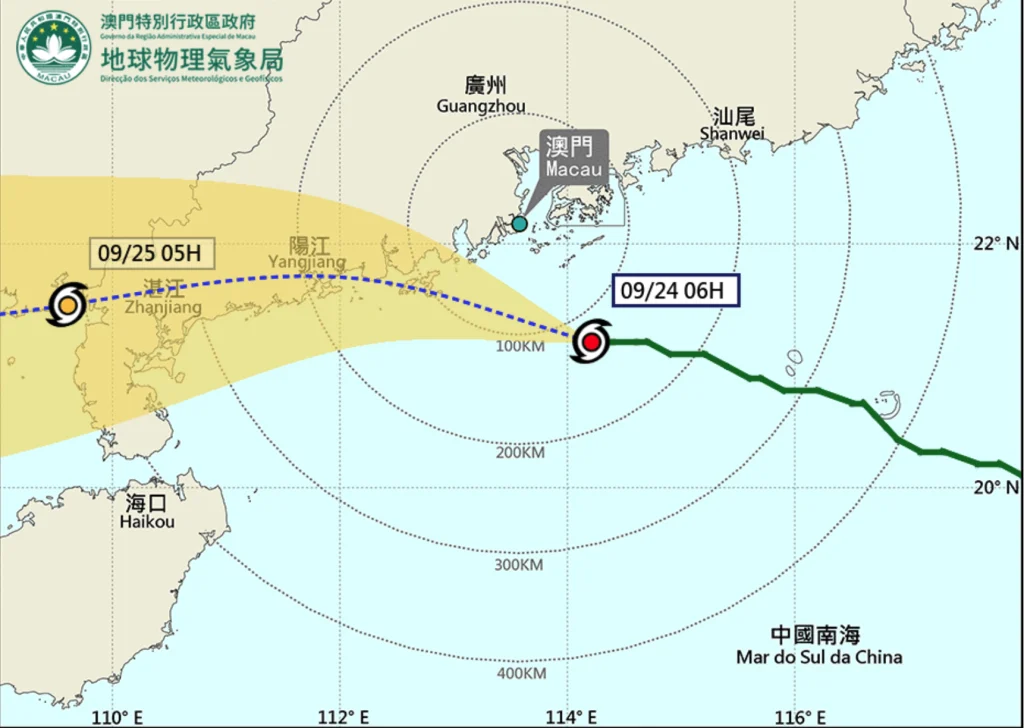 Segundo os serviços meteorológicos, o centro da tempestade tropical vai passar muito próximo de Macau, provocando ventos sustentados de pelo menos 118 km/h, acompanhados de rajadas fortes. O território deverá enfrentar condições meteorológicas severas, com riscos acrescidos para a população e infraestruturas.