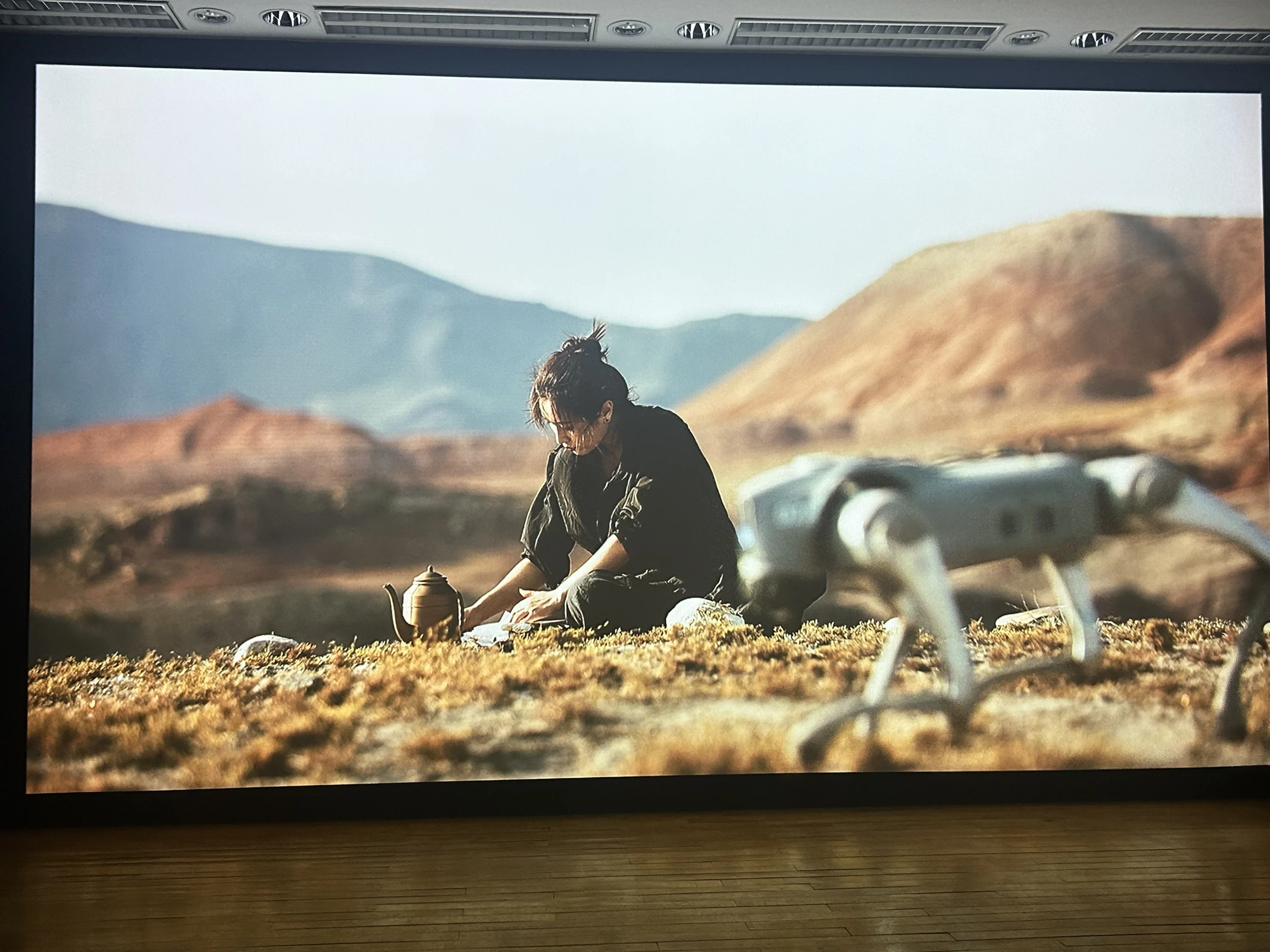 - O diálogo com a obra de Almeida foi um encontro com questões sobre as quais tenho refletido; ajudou-me a reforçar e aprofundar a motivação artística e a visão do meu trabalho – questiono-me muitas vezes sobre o valor do ser humano. Quando ouvi uma IA dizer que, se pudesse ser humana, “gostaria de apanhar chuva, sentir a humidade”, tocou-me profundamente. A tecnologia replica inúmeras formas, mas não o contacto entre corpo e matéria, nem a capacidade humana de encontrar o mundo de forma direta. O peso da vida nunca esteve na eficiência, mas no sentir, em cada momento real de encontro. Tal como na minha obra, em que o cão robot aparece e desaparece, por acaso; a sua lógica mecânica não compreende este “tempo inútil”; o olhar do algoritmo contrasta subtilmente com a minha concentração física, mostrando diferentes formas de existir e interpretar o mundo. A resposta está em encontrar WU (tudo o que há – a verdade).