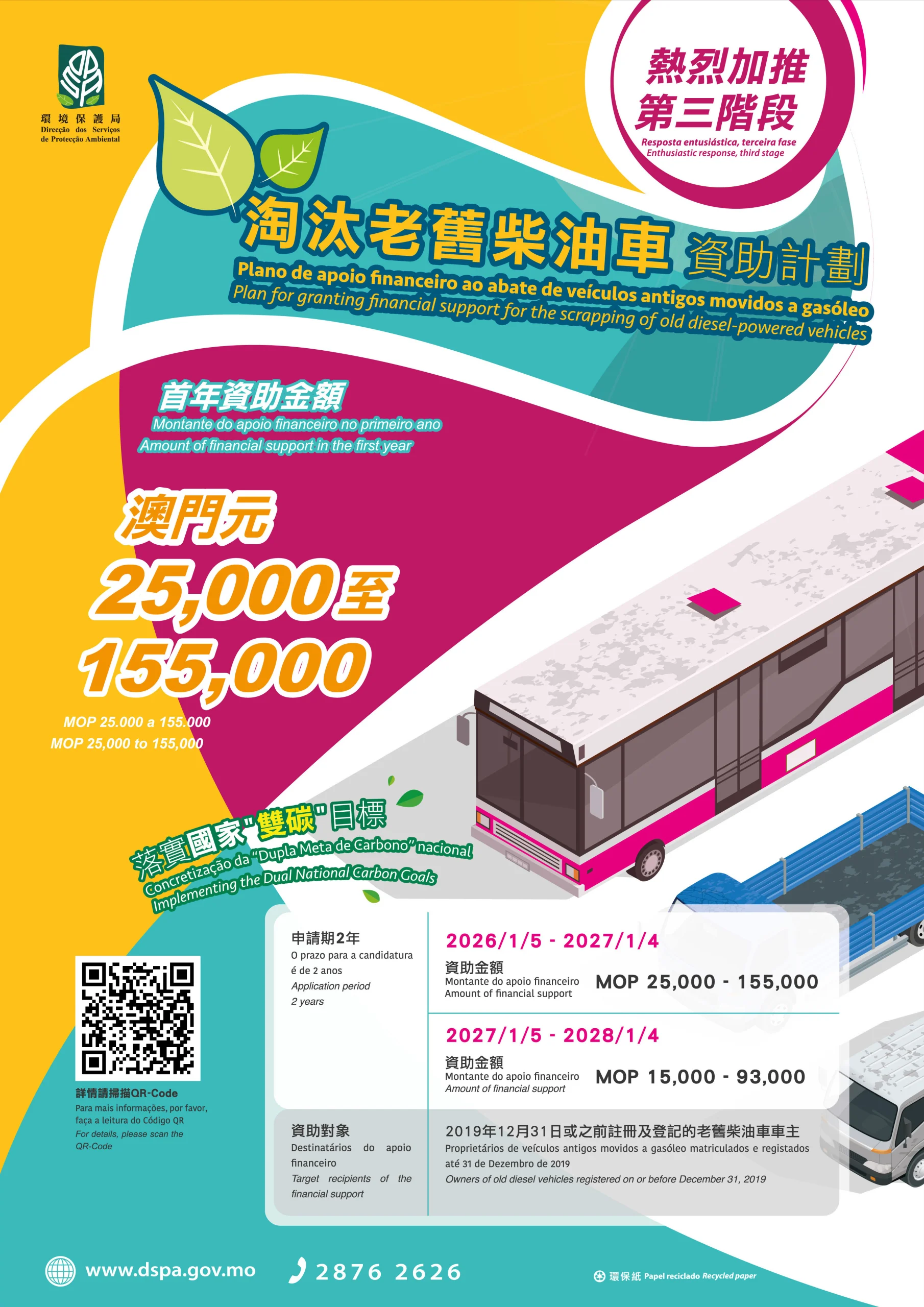 O prazo de candidaturas à terceira fase do Plano de apoio financeiro ao abate de veículos antigos movidos a gasóleo, uma iniciativa do Governo da Região Administrativa Especial de Macau (RAEM) destinada a reduzir a poluição atmosférica e melhorar a qualidade do ar, vai decorrer até 4 de Janeiro de 2028.