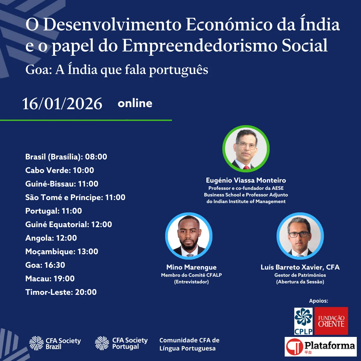 A entrevista será conduzida por Mino Marengue, membro do Comité Comunidade CFA de Língua Portuguesa, e a abertura da sessão ficará a cargo de Luís Barreto Xavier, CFA. O evento terá uma abordagem informativa e analítica, destinada a profissionais, académicos e interessados em mercados internacionais e desenvolvimento económico.