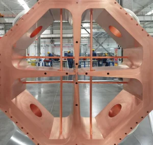 Trabalhadores na China fabricando componentes da instalação de terapia com iões pesados (forma avançada de radioterapia que utiliza partículas pesadas para destruir células cancerígenas) (Fotografia: Xinhua).