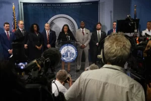 Fulton County District Attorney Fani Willis holds a press conference after a grand jury voted to indict former US President Donald Trump and 18 others on August 14, 2023. The Georgia prosecutor who brought sweeping charges against former president Donald Trump said that she wants to hold their trial “within the next six months.”