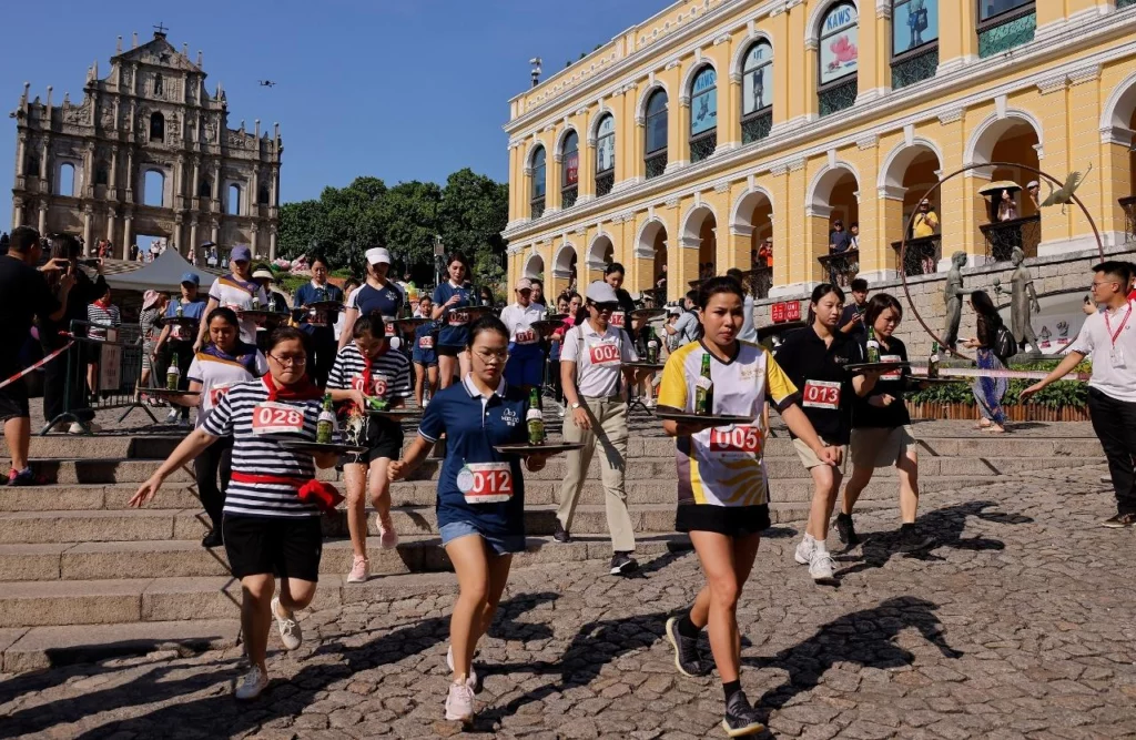 Upon the sound of the air horn, the special guest contestant, Macao Tourism Mascot MAK MAK in the outfit for Macao Courtesy Campaign, joined the other contestants to set off from the Ruins of St. Paul’s, each balancing a bottle of Macau Beer on their tray.