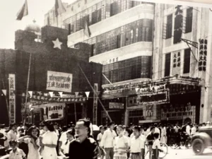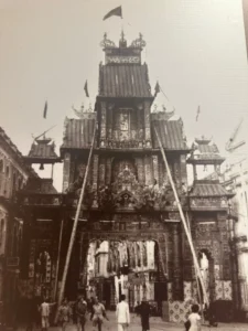 According to Agnes Lam, in November 1949, there was a significant public celebration in Macau: the erection of an arch in front of the Ping An Theater on Almeida Ribeiro Avenue. This arch, adorned with large portraits of Mao Zedong and Zhu De, marked the first structure of its kind in Macau related to the founding of the People’s Republic of China.