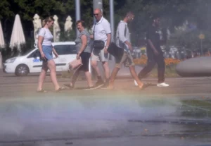 (241005) — WARSAW, Oct. 5, 2024 (Xinhua) — People walk by a spray installation amid a heatwave in Vienna, Austria, July 16, 2024. (Xinhua/He Canling)