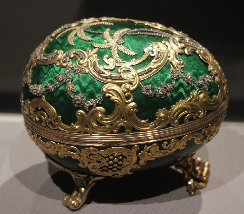 The locket, a Fabergé egg adorned with 60 white diamonds and 15 blue sapphires, features an 18K gold miniature octopus inside. It is inspired by the James Bond film “Octopussy,” which involves a Fabergé egg heist.