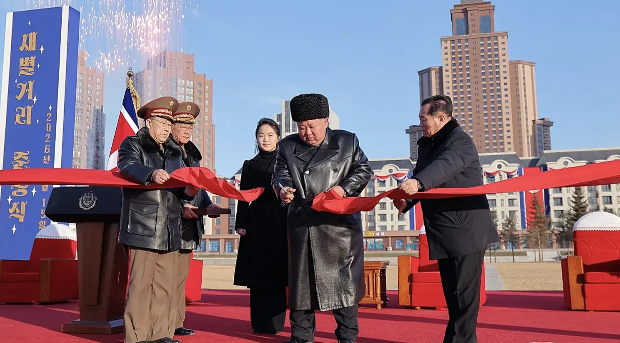 The newly built district was presented as a tribute to the “spirit and sacrifice” of soldiers who fought alongside Russian forces in the Ukrainian conflict. Images released by official outlets show Kim Jong Un touring the area, greeting residents and consoling relatives of the fallen, accompanied by his daughter.