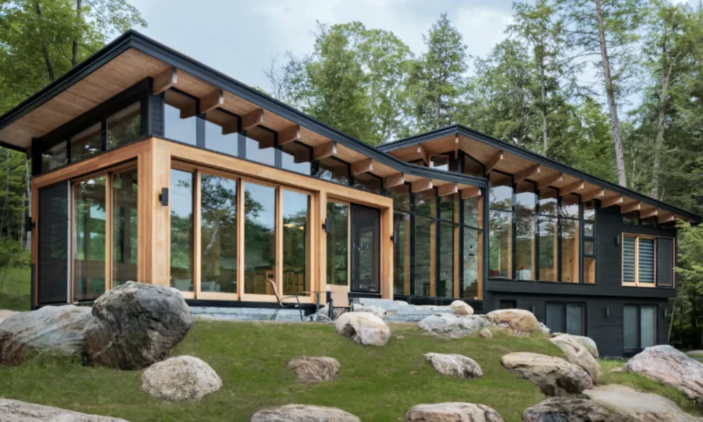 The Barlochan cottage is about two hours by car from the Toronto international airport and was designed as a year-round usable refuge, with a Douglas fir wood structure adapted to the geography of the Canadian Shield.