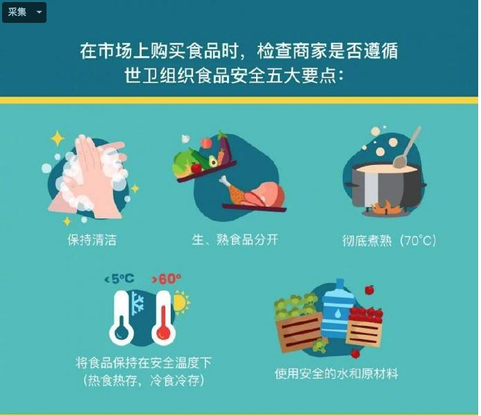 - 在市場上購買食品時,檢查商家是否遵循世衛組織食品安全五大要點,保持清潔,生、熟食品分開,徹底煮熟(70攝氏度),將食品保持在安全溫度下(熱食熱存,冷食冷存),使用安全的水和原材料。