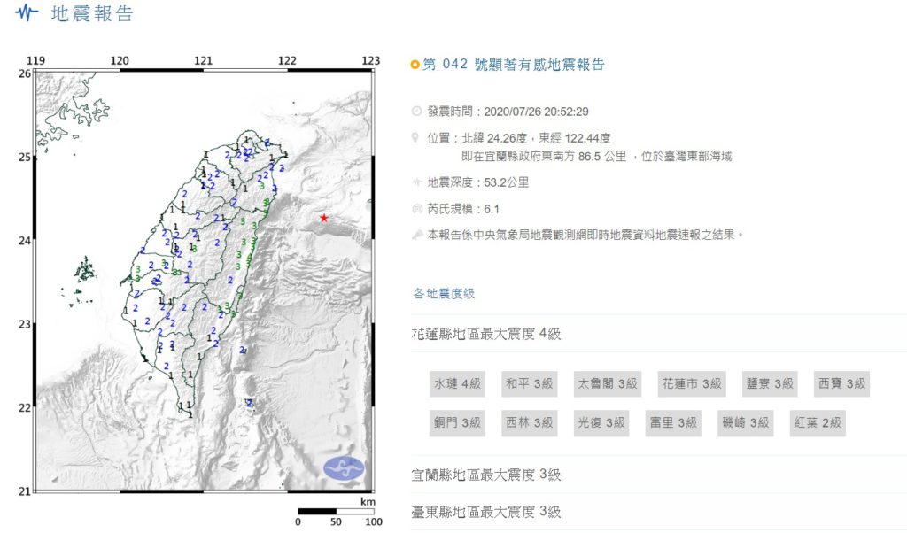 台灣東部海域26日20時52分發生6.1級地震,震中位於北緯24.26度、東經122.44度,即在宜蘭縣政府東南方86.5公里,震源深度53.2公里。