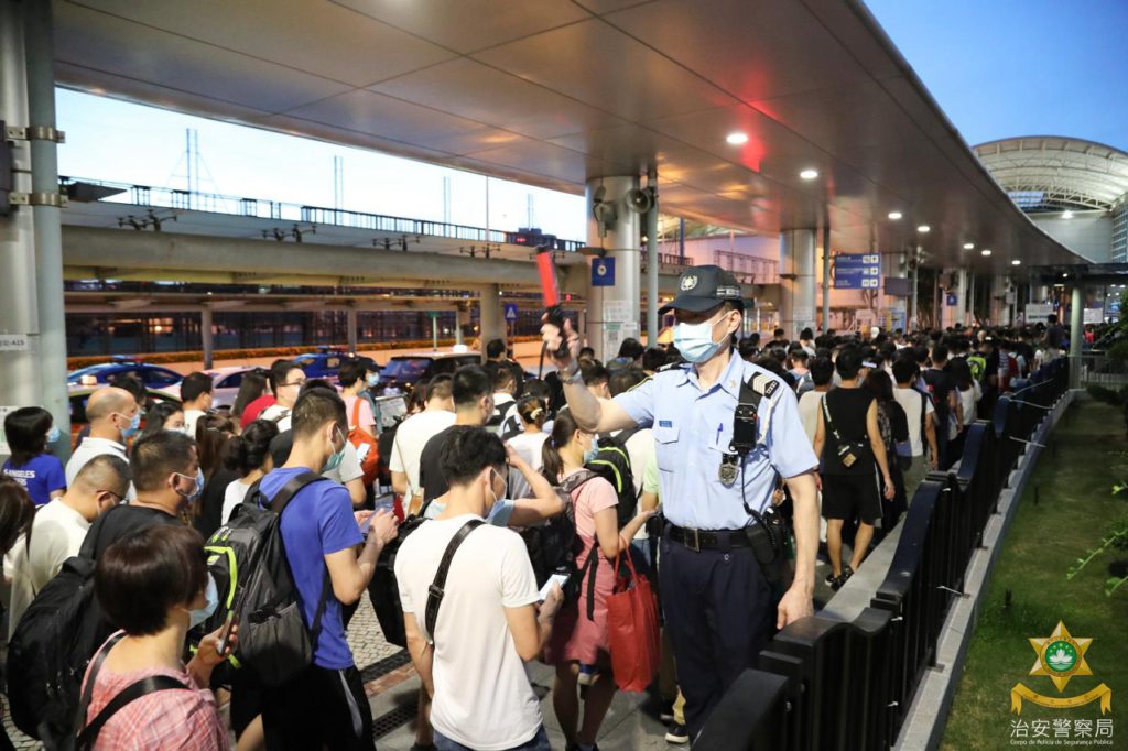 為應對關閘口岸的離境高峰,治安警察局已加派警力於關閘廣場一帶維持秩序,疏導人潮,並因應實際情況採取人潮管制措施,通關人士應遵守現場警員指示有序行進,耐心等候,以確保良好的通關秩序和效率。