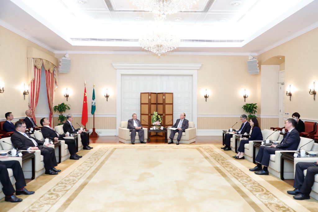 行政長官賀一誠會見澳門法律工作者聯合會會長崔世昌一行,討論推動法制建設等議題。
