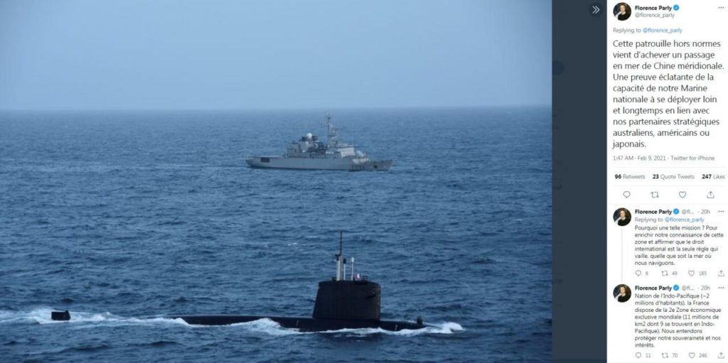 澳門電台消息,法國 2艘海軍艦艇近日在南海巡邏,包括 1艘核潛艇。防長帕利表示,行動證明法方與美、日等戰略夥伴一樣,有能力在相關海域長時間自由航行。