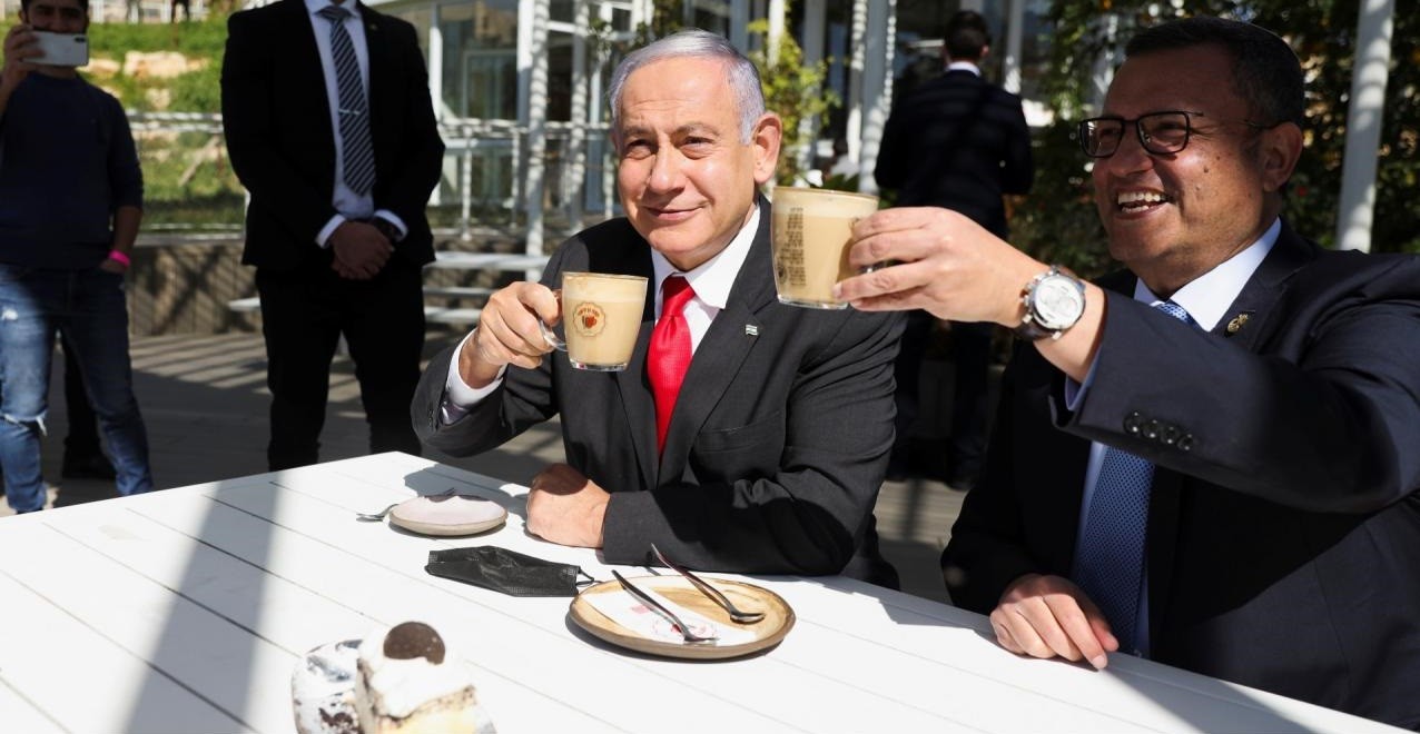 以色列總理內塔尼亞胡和耶路撒冷市長里昂週日到當地一家咖啡館用餐,內塔尼亞胡呼籲民眾仍要保持警惕,要戴口罩,保持社交距離。 (
