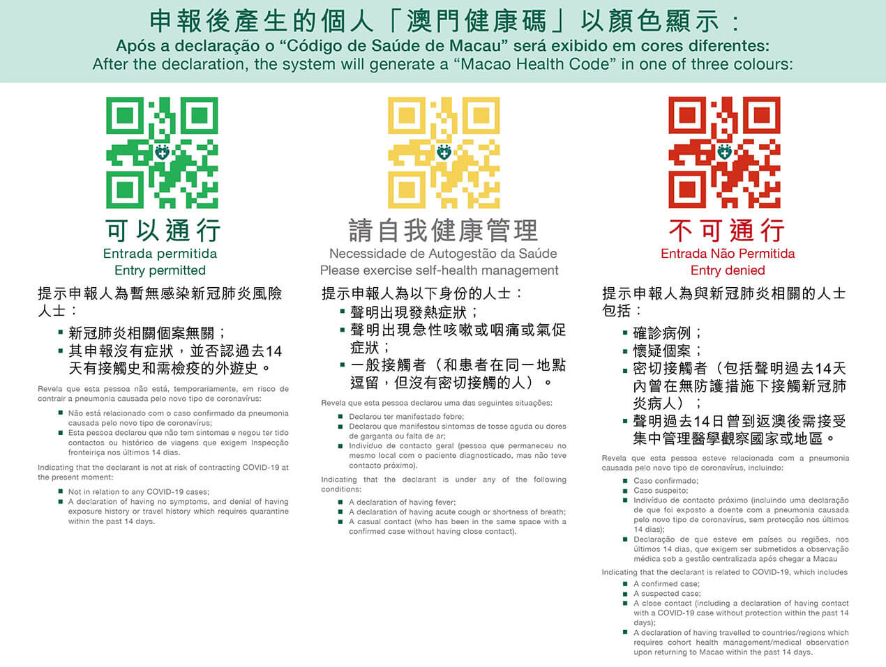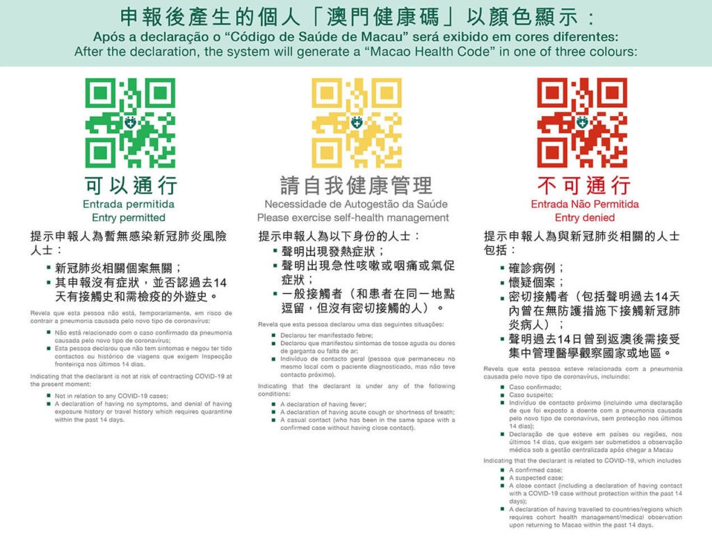 澳門新型冠狀病毒感染應變協調中心表示,要求全澳各酒店、購物商場、政府部門、出入境大樓、各醫療機構和餐廳,嚴格執行檢查健康碼、測量體溫及清潔消毒等工作,所有持黃色和紅色健康碼人士不允許進入上述場所。
