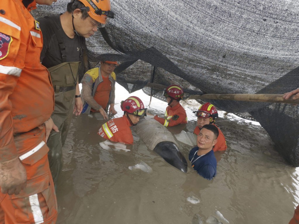 據新華社報導,由於高溫天氣,救援人員使用冰塊為擱淺的瓜頭鯨降溫,不斷把海水淋在牠們身上,以防止被泥漿嗆到。