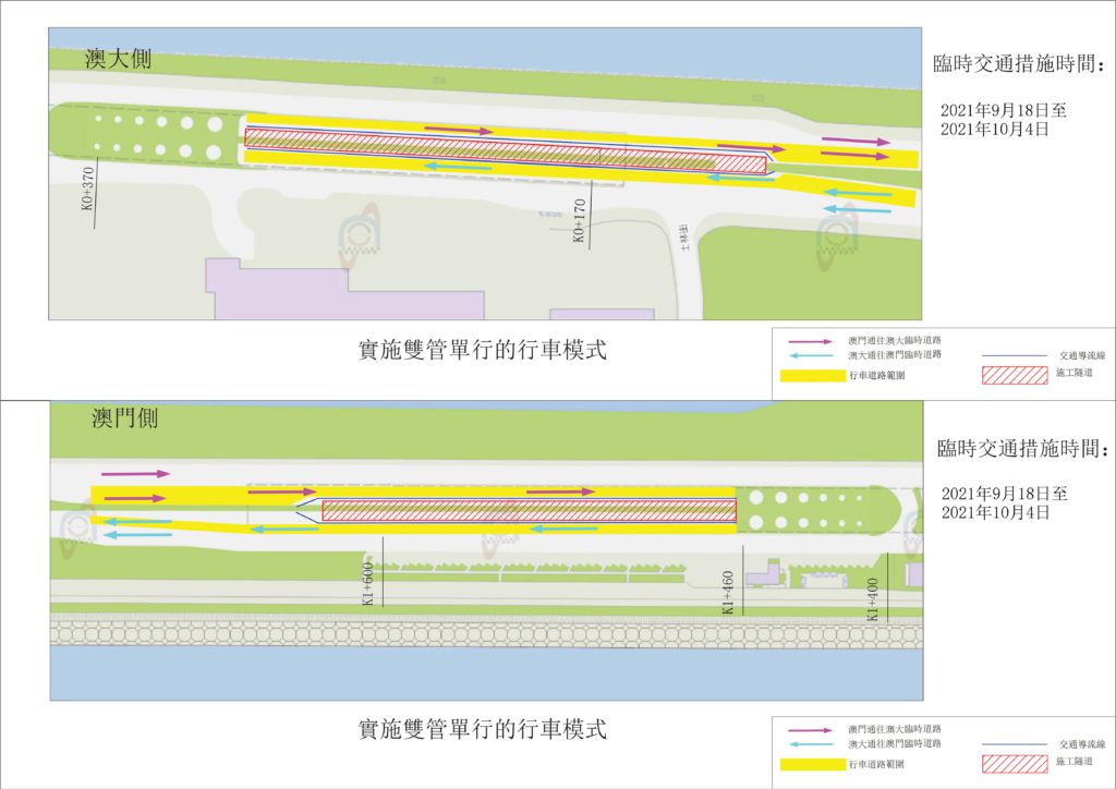 (1) 2021年9月18日至10月4日期間,將實施雙管單行的行車模式,即只開放按行車方向靠左車道供公眾使用,此段期間將進行相關的工程過渡工作,(詳見圖1);